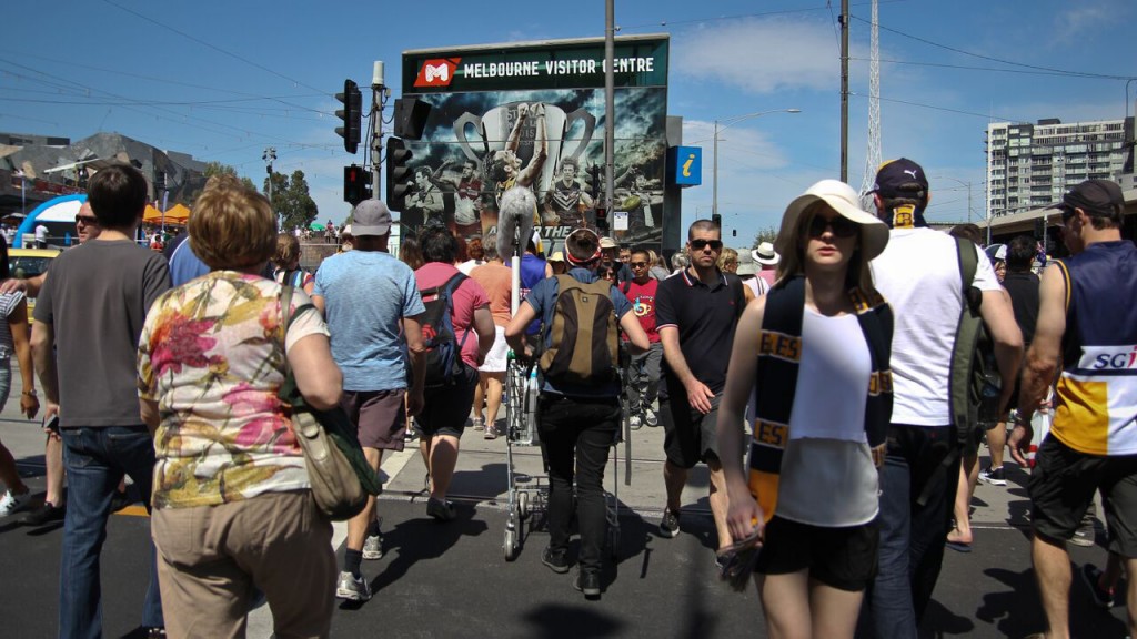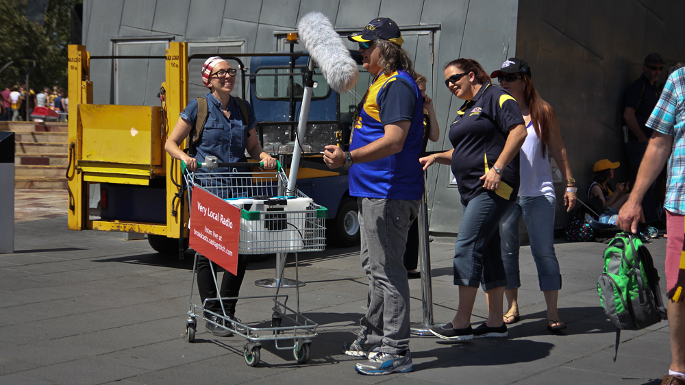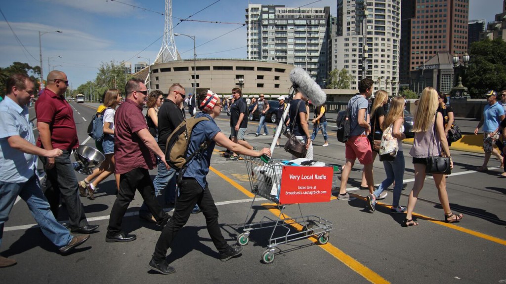 At midday, I tune in to Very Local Radio, a live performance and/as live Internet radio stream that uses portable broadcasting technologies to highlight interactions of sound, place and space in realising an ephemeral community. Internet radio is the only way to hear the broadcast, though the live performance can be witnessed. If you spot a shopping trolley laden with broadcast equipment and a boom microphone being pushed through Melbourne’s city centre – across four trips, back and forth, along St Kilda Road and Swanston Street – you are likely witnessing the live event. But without your headphones connecting you to that online stream, you cannot know what is being broadcast.